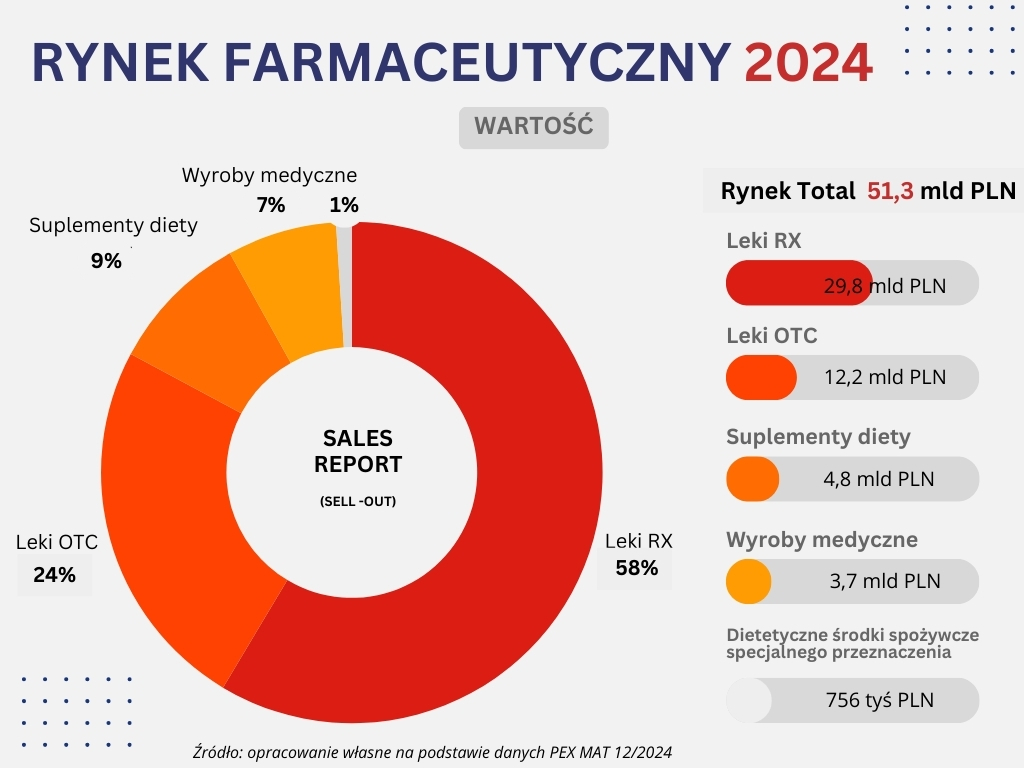 Rynek farmaceutyczny wg danych rynkowych sell-out (dane PEX MAT 12/2024) w roku 2024 wart był 51,3 mld zł i zanotował 12% wzrost wartościowy (Val), przy 3% wzroście w opakowaniach (Un). Ważnym czynnikiem wzrostu sprzedaży dla większości firm w ubiegłym roku był wzrost cen, ale wzrosty ilościowe również miały swój impakt na rynek total.