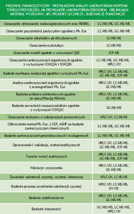 Laboratoria kontraktowe oferują unikalną możliwość skalowania mocy przerobowych w zależności od aktualnych potrzeb klienta. Czy to rutynowe badania kontroli jakości, kompleksowa analiza zanieczyszczeń, opracowanie i walidacje metod analitycznych, długoterminowe badania stabilności , laboratorium kontraktowe wypo- sażone w najnowocześniejszy sprzęt MS, HPLC, GC i doświadczony zespół jest w stanie szybko i efektywnie sprostać tym wymaganiom, bez konieczności ponoszenia przez zakład farmaceutyczny kosztów utrzymania rozbudowanego, własnego laboratorium.